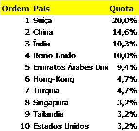 Em termos de grandes importadores a Suíça é também o primeiro, logo seguida da China e da Índia.