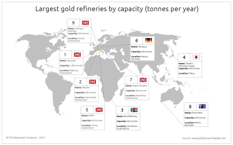 A Suíça actua também como grande refinadora, sendo que aí é feita uma fatia significativa da refinação mundial.