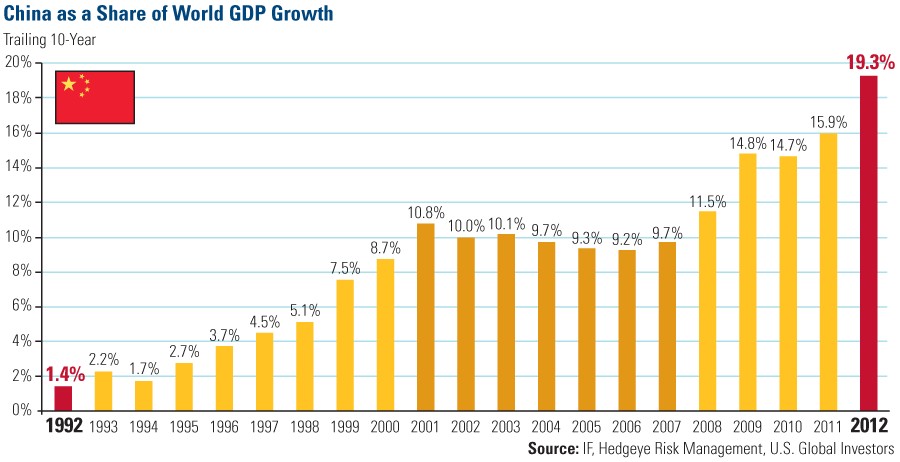 Assim, enquanto os países ocidentais se mantêm basicamente num período de estagnação a China continuará a crescer a mais do dobro da taxa de crescimento económico mundial e a aumentar a sua quota na economia global.