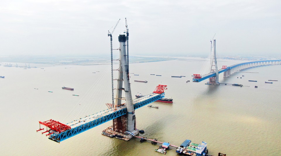 Construção de ponte sobre o rio Yangtze em Shanghai